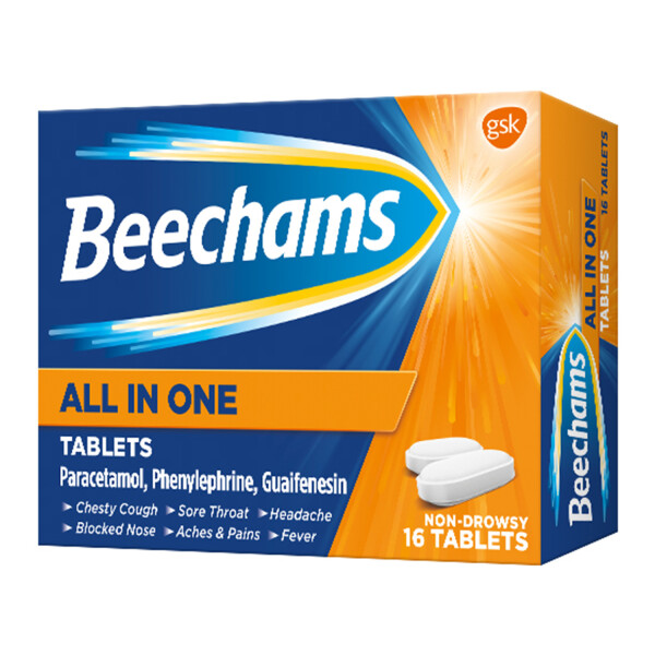Beechams All In One Tablets 16’s is a fast-acting, multi-symptom cold and flu treatment designed to provide effective relief from a wide range of symptoms including headache, fever, sore throat, blocked nose, and chesty cough.